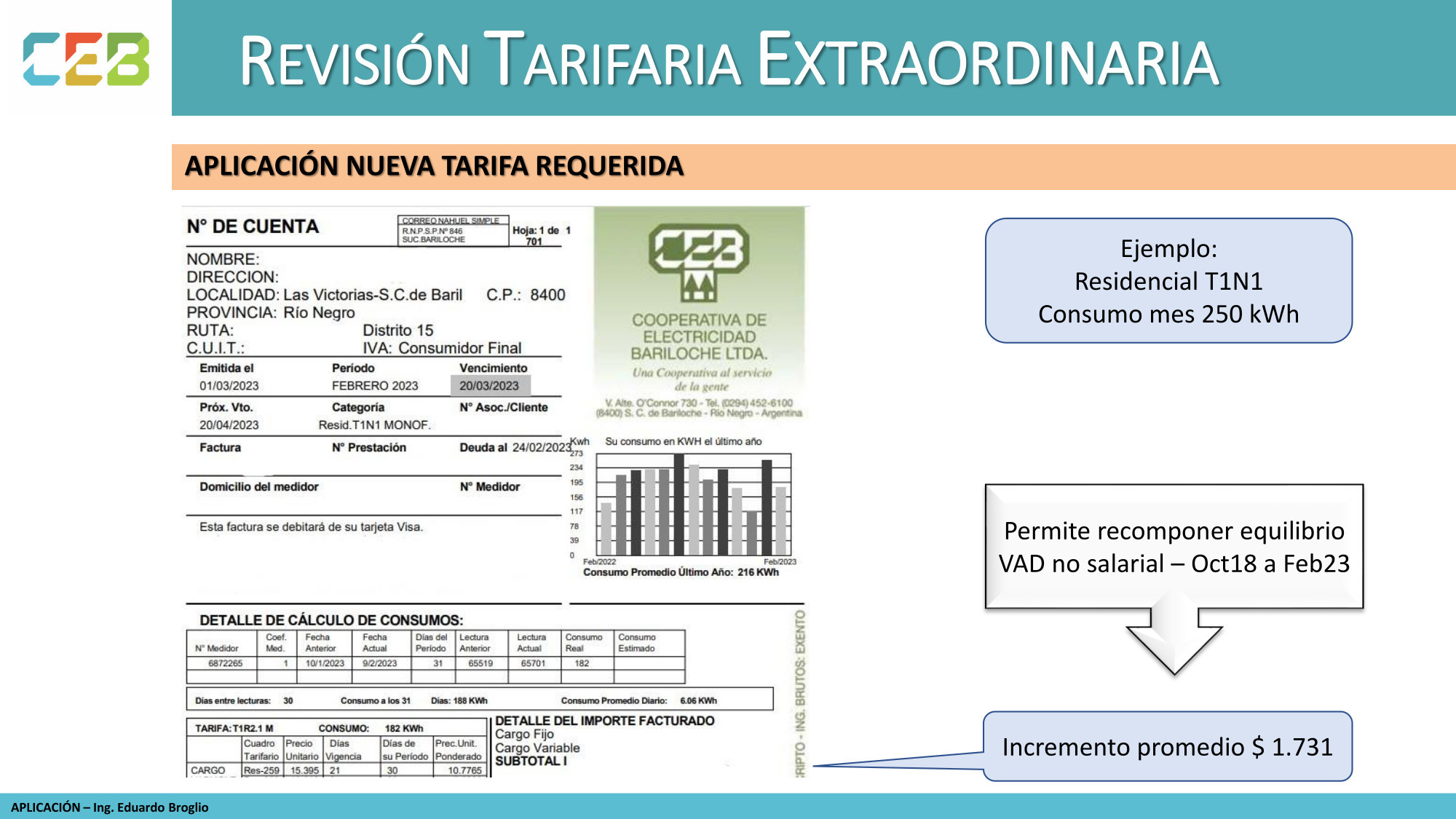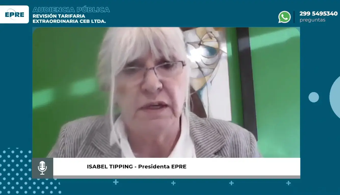 Luego de una introducción sobre los antecedentes relacionados con la tarifa eléctrica de la CEB, Tipping aclaró que “el objeto de esta audiencia es la actualización al 28 de febrero de 2023 de los costos no salariales que integran el Valor Agregado de Distribución (VAD) determinados en la revisión ordinaria quinquenal e implementados mediante Resolución EPRE 259/19”.